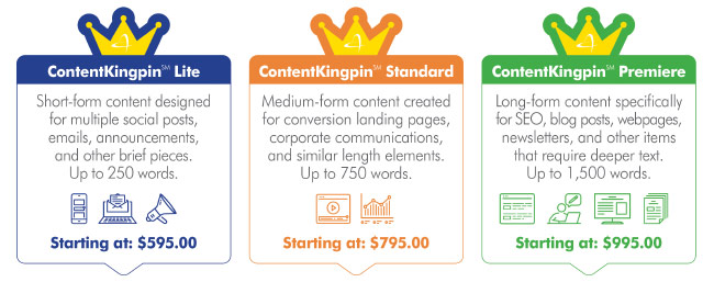 Choose from three popular pre-defined content development packages, or let’s have a conversation to help you define a custom content development plan that matches your needs. ContentKingpinSM is your time-saving go-to solution for content development, only from ASTRALCOM.